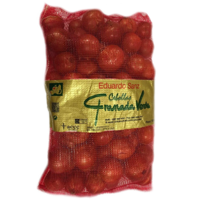 ENVASADO – en saco de malla roja o naranja con banda central marca Granada Verde.